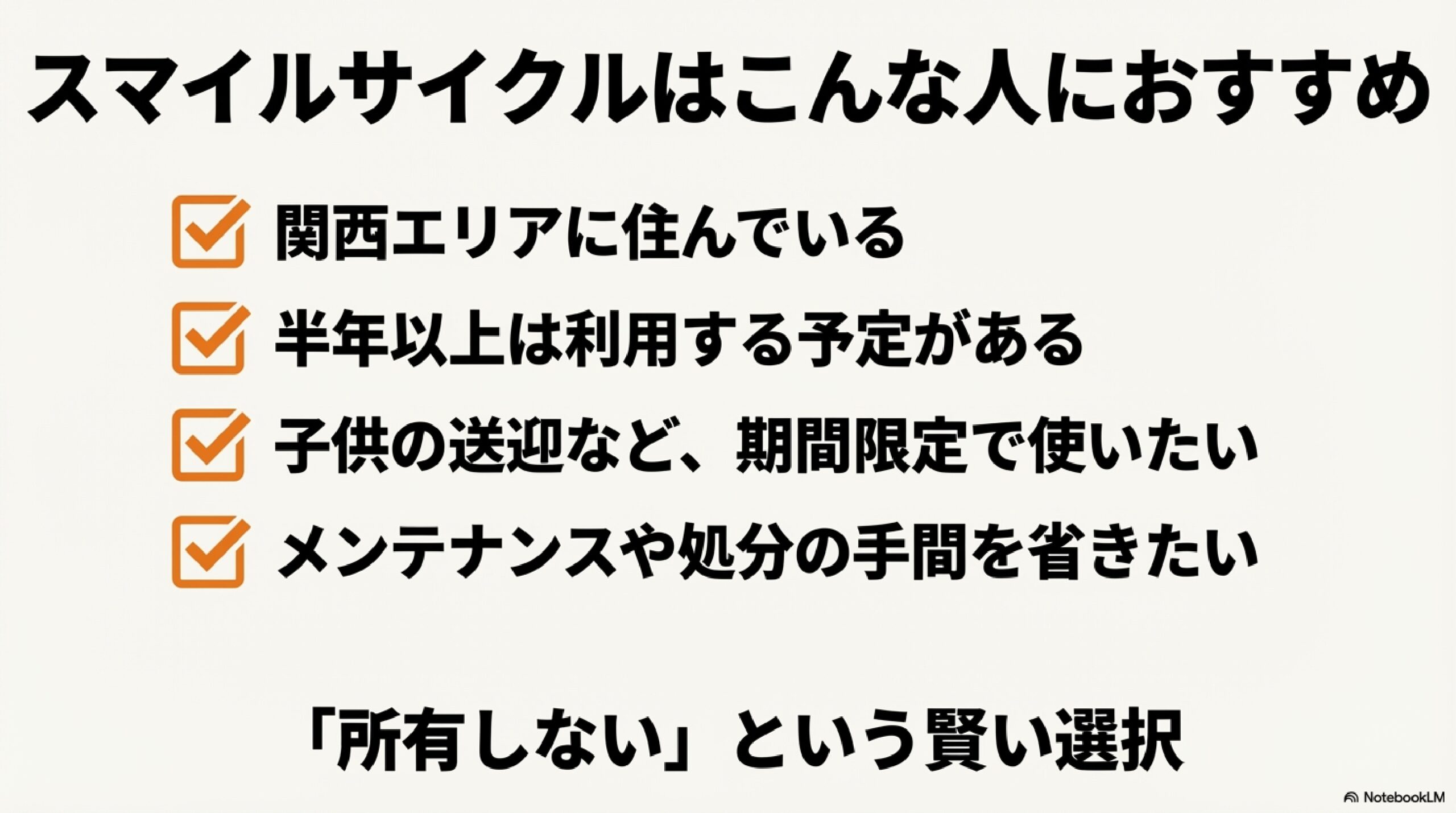 ただ、スマイルサイクルの本当の価値は「維持管理の手間からの解放」と「ライフスタイルの変化への柔軟な対応」にあると私は思います。