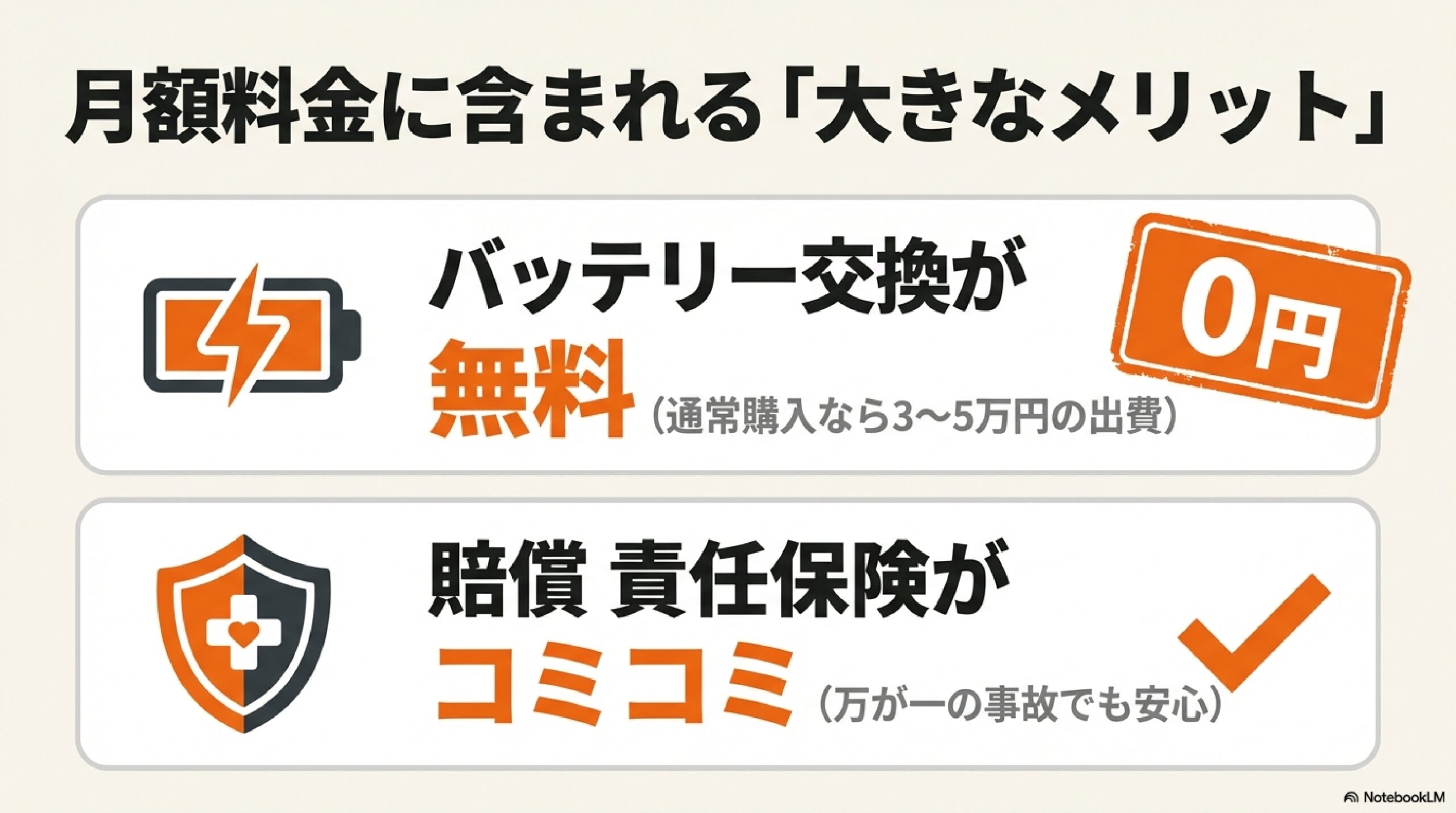 | 月額・維持費 | メンテナンス費、バッテリー交換費 | 月額5,500円(保険・メンテ込) |