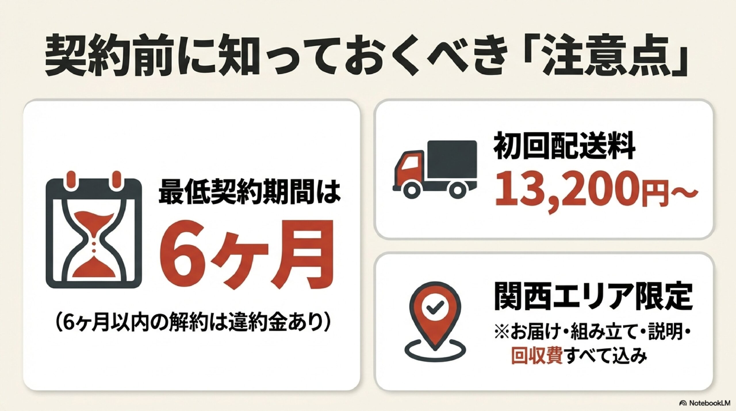 一方で、関西圏限定のエリア制限、最低利用期間6ヶ月の縛り、日割り返金に対応していない点は、契約前に必ず理解しておくべきデメリットです。