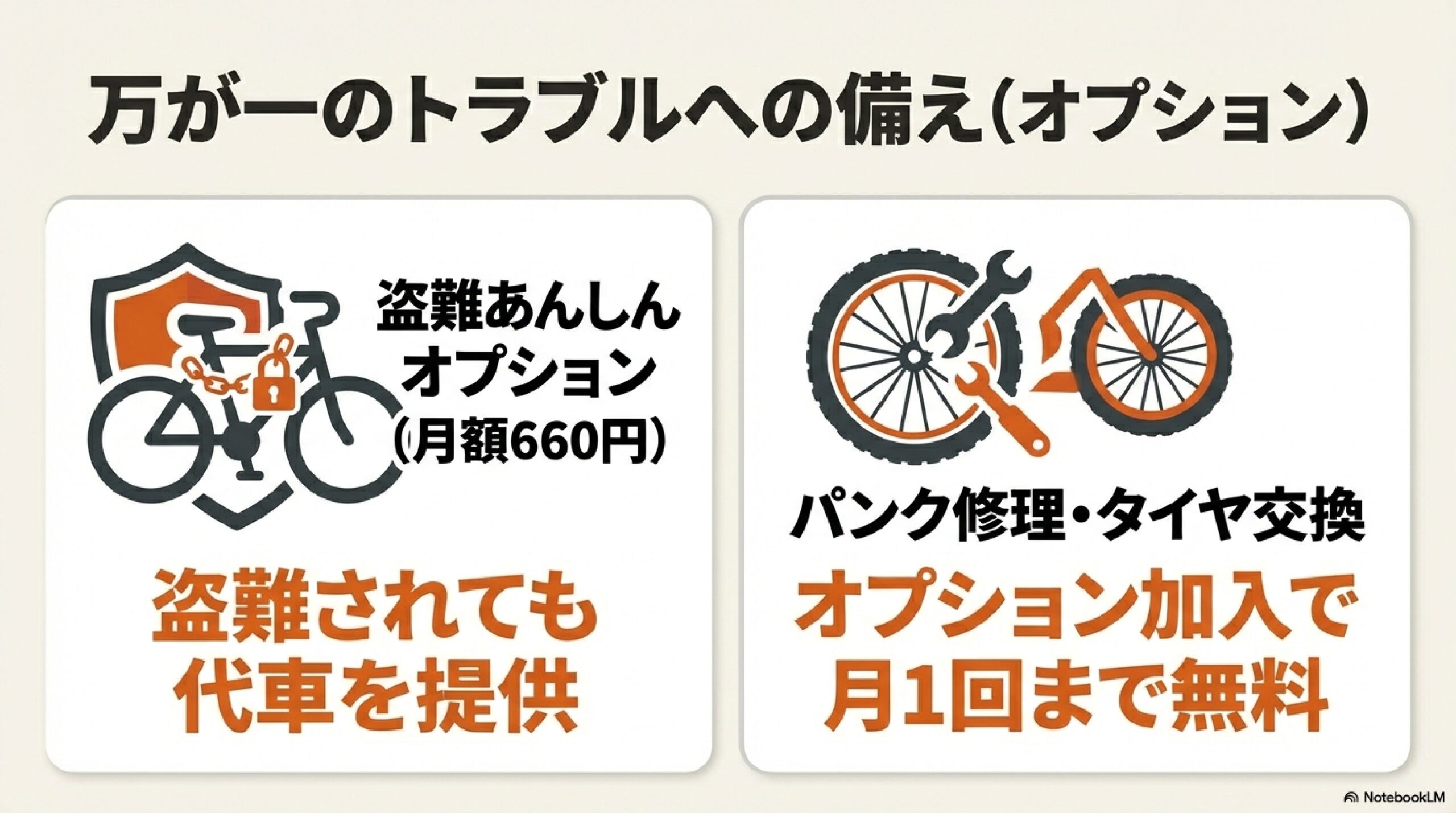 パンクなどの日常的なトラブルに対応するオプションです。加入していれば月1回までタイヤの無料交換が受けられます。未加入の場合はパンク修理に1回11,000円(税込)かかるので、自転車を頻繁に使う方は加入しておいたほうが安心ですね。